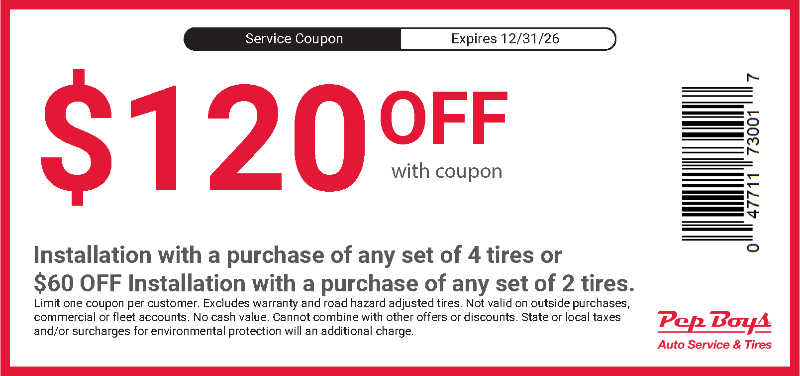 - $60.00 off installation with purchase of 2 tires ($120 off installation with purchase of 4 tires)*